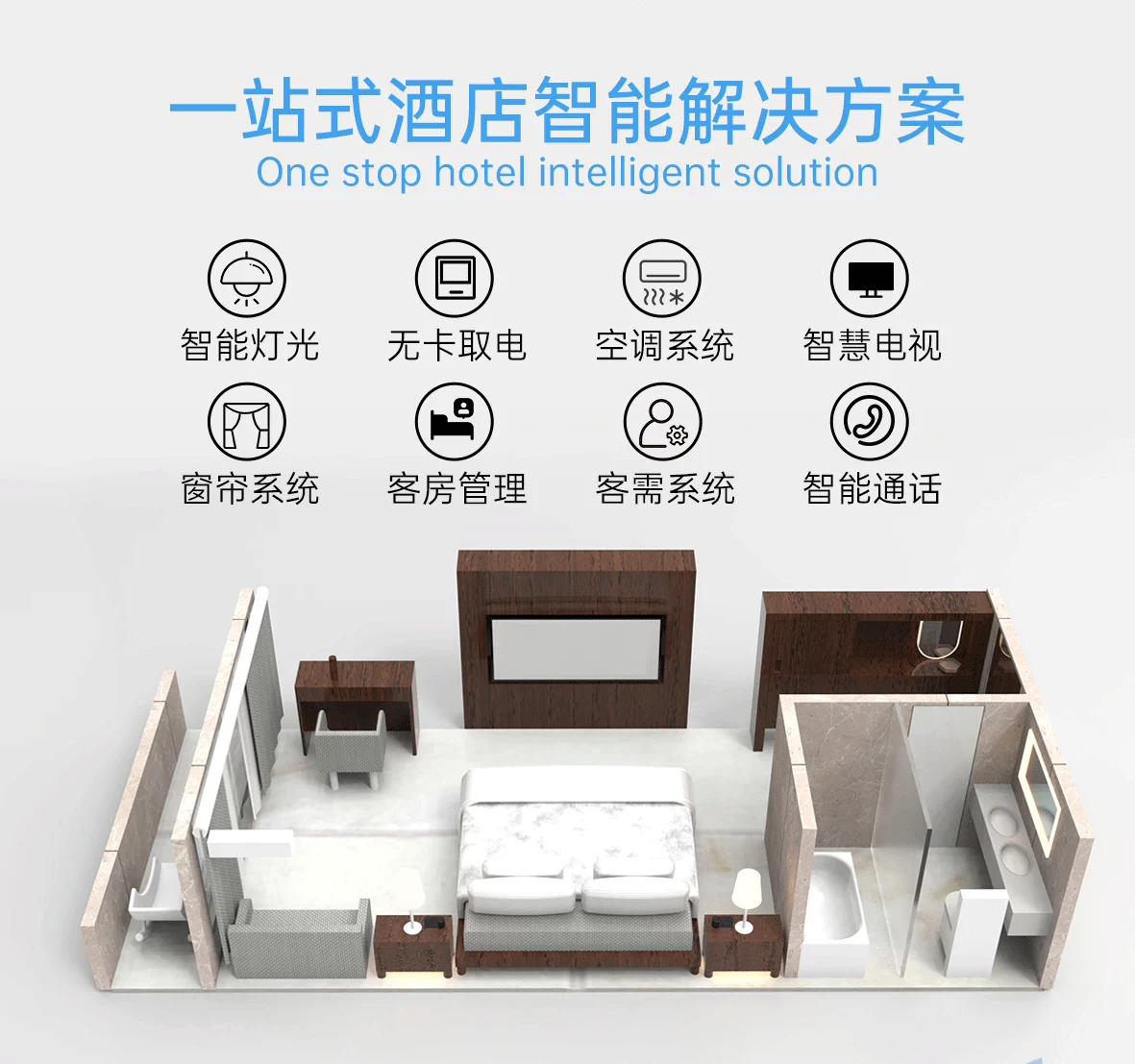 5.智慧語音控制系統(tǒng)功能:智能管家呼叫服務(wù)(打掃房間、開發(fā)票、酒店介紹、訂餐等);智能語音控制還可以讓住客不用動手即可操控整個房間的電視、空調(diào)、窗簾、照明系統(tǒng)等,除此之外還可以解決問詢、通知前臺等客需服務(wù)。